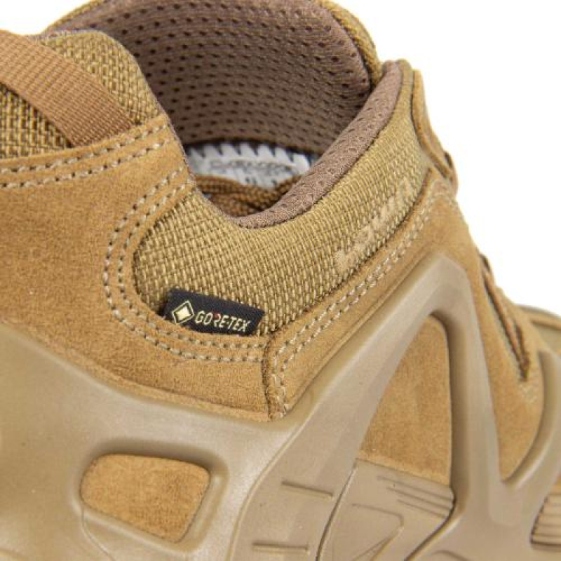 Верх взуття виготовлений зі шкіри койота, що забезпечує міцність і водонепроникність. Мембрана GORE-TEX забезпечує відмінну вентиляцію та захист від дощу та інших погодних умов. Завдяки цьому, кросівки забезпечують комфорт протягом усього дня, незалежно від погодних умов.