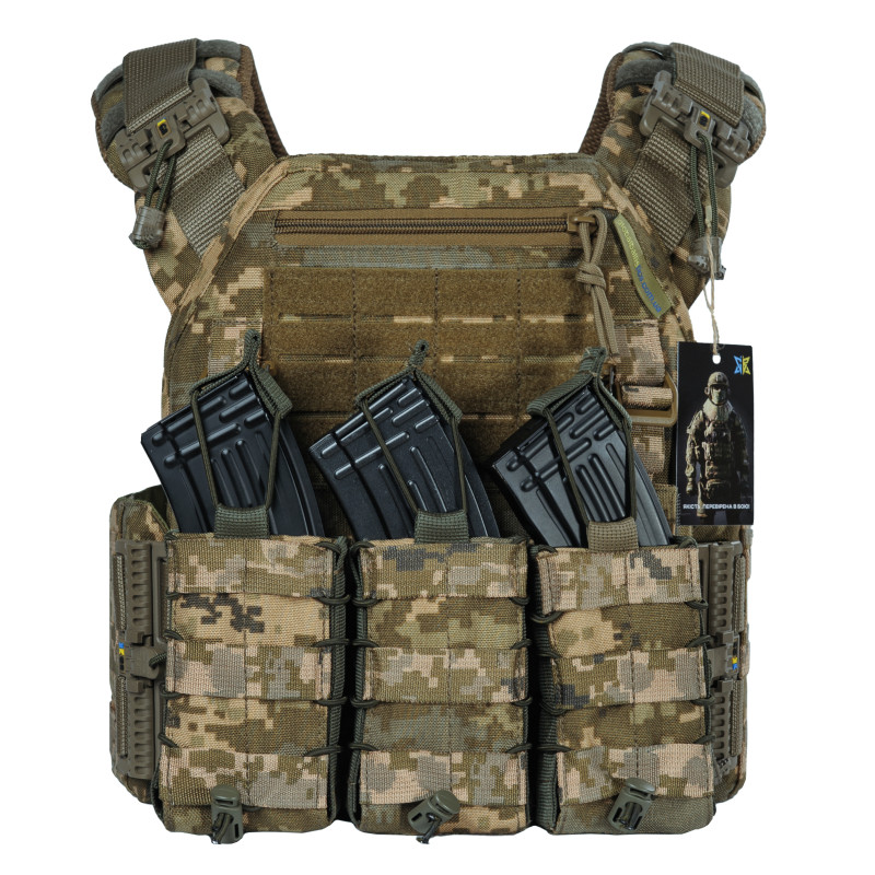 Данная модель плитоноски имеет уникальный пиксельный дизайн, который помогает максимально интегрироваться в окружающую среду и обеспечивает дополнительную маскировку оператора на поле боя.