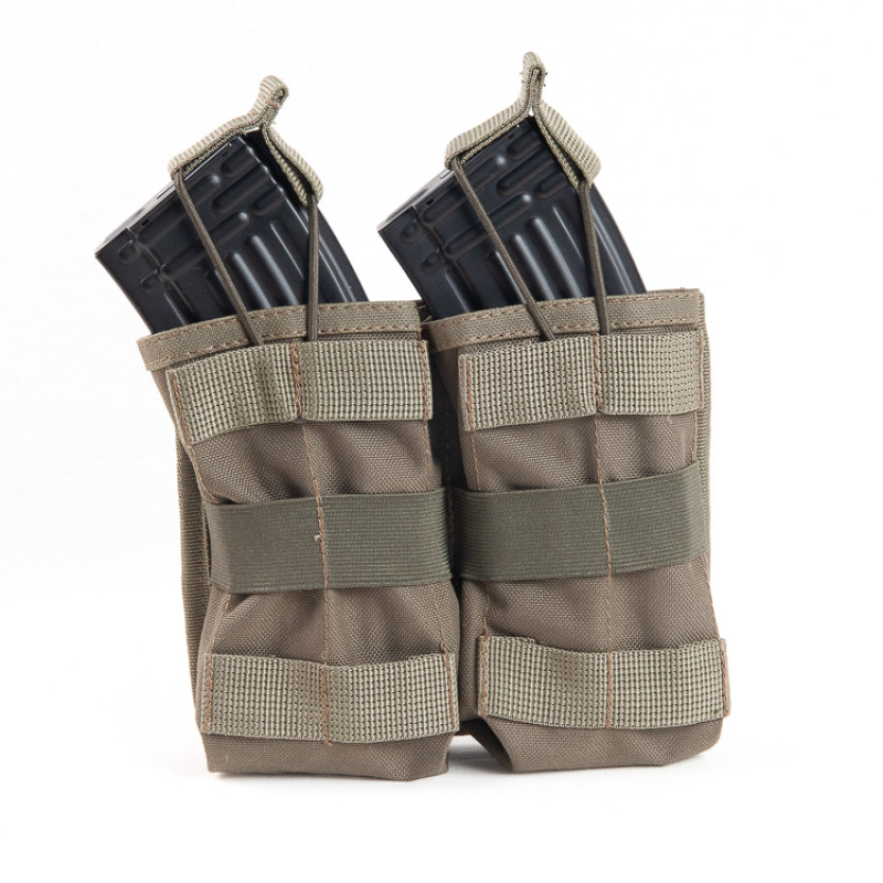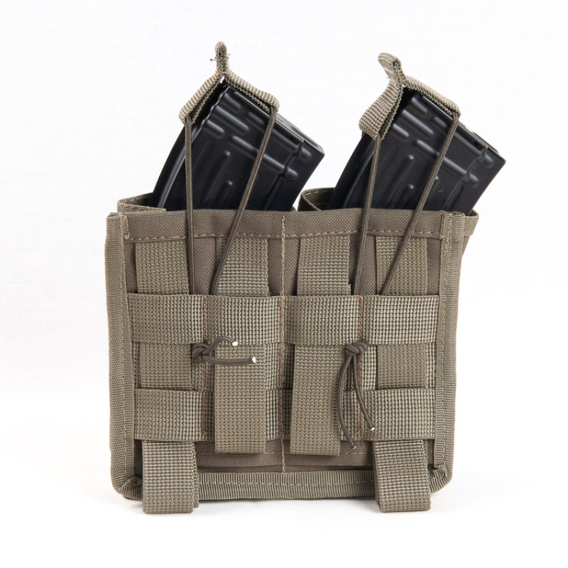 Подсумок имеет двойную конструкцию, что позволяет вместить два магазина АК. Он оснащен синтетическими лентами на передней и задней части, которые обеспечивают надежную фиксацию магазинов внутри подсумка. Это позволяет быстро и эффективно извлекать патроны во время стрельбы.